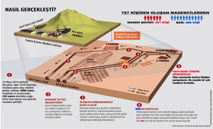 *Gaz Ölçümleri ve Havalandırma: Linyit kömür madenlerinde metan gazı birikimi ölümcül patlamalara yol açabilir. Soma’da, gaz seviyelerinin sürekli ölçülmesi ve havalandırma sistemlerinin etkin çalışması sağlanmakta ancak; uygulamada sık sık aksaklıklar görülmekteydi. Bazı işçiler ve sendikalar, metan sensörlerinin düzenli çalışmadığını ve ölçümlerin yetersiz olduğunu rapor etmişti.
