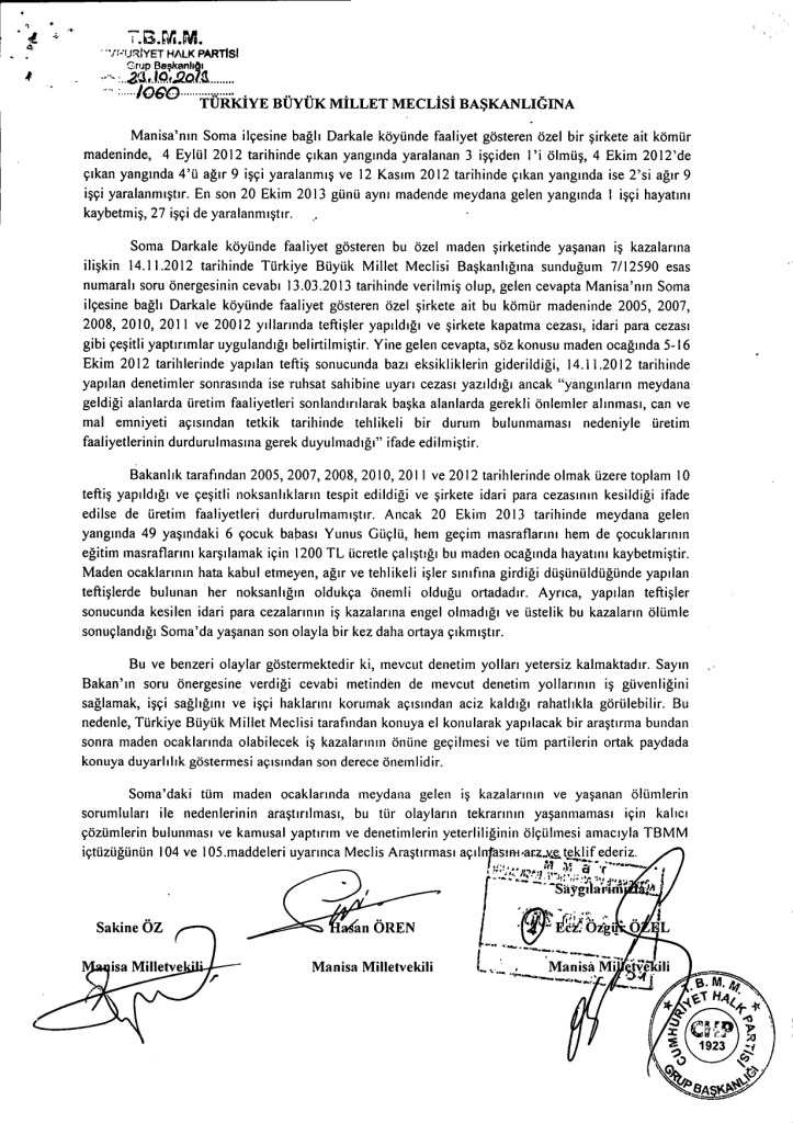 23 Ekim 2013 tarihli Soma ve yöresinde yaşanan/yaşanması muhtemel kaza ve cinayetleri önleme maksatlı ele alınan bu meclis araştırma önergesi iktidar partisi olan AKP’nin red oylarıyla reddedilmişti.