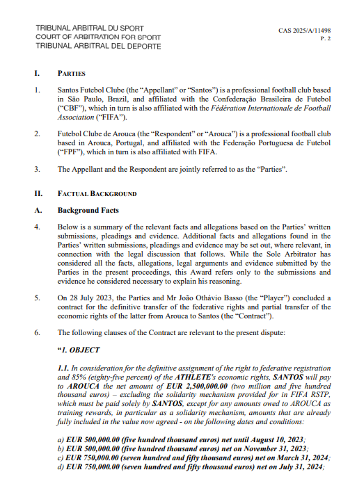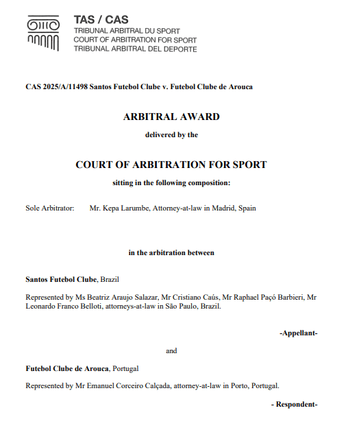 CAS 2025/A/11498 – Santos Futebol Clube (Brezilya) v. Futebol Clube de Arouca (Portekiz)