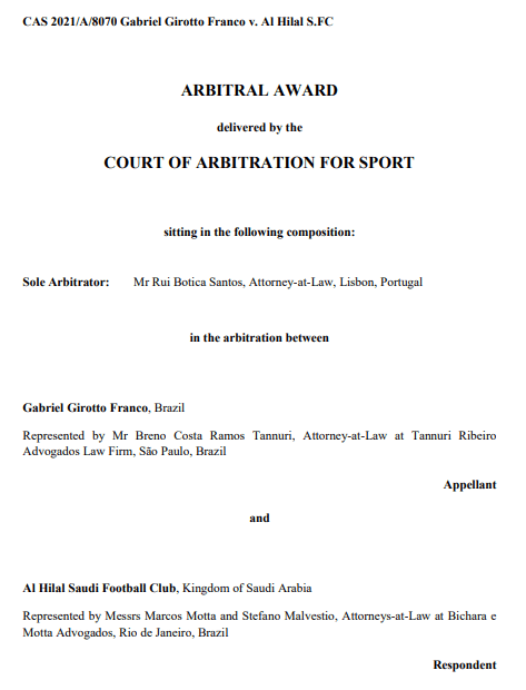 CAS 2021/A/8070 – Gabriel Girotto Franco v. Al Hilal Saudi Football Club