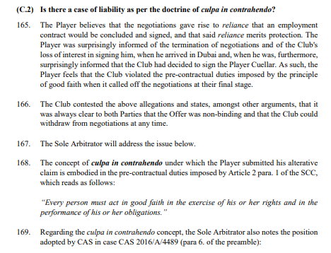Oyuncu ayrıca kulübün görüşmeleri son anda kesmesinin culpa in contrahendo yani sözleşme görüşmelerinde kusurlu davranış kapsamında değerlendirilmesi gerektiğini ileri sürmüştür.
