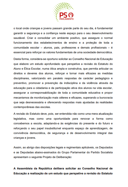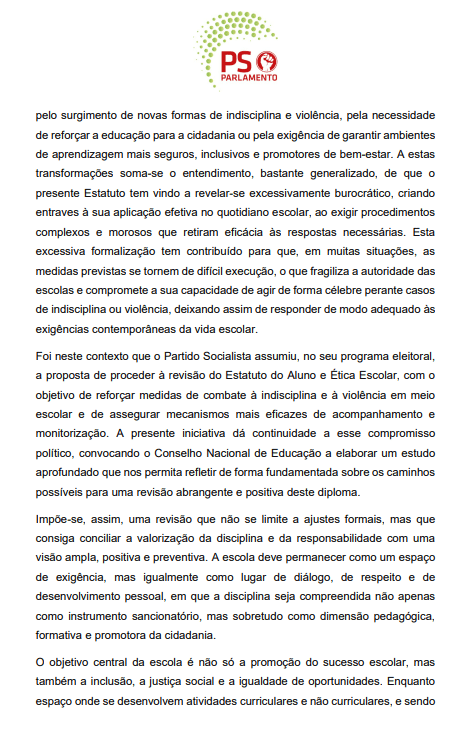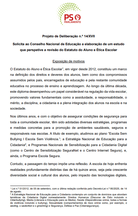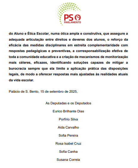 La iniciativa legislativa presentada a la Asamblea Legislativa de Portugal el 15 de septiembre de 2025 por los diputados Eurico Brilhante Dias, Porfírio Silva, Aida Carvalho, Sofia Pereira, Rosa Isabel Cruz, Sofia Canha y Susana Correia representa un compromiso claro con la revisión del Estatuto del Estudiante y la Ética Escolar. Su propuesta reconoce que, si bien el estatuto ha proporcionado un marco sólido para los derechos de los estudiantes y la disciplina escolar, su complejidad burocrática y sus disposiciones obsoletas limitan su efectividad práctica en el entorno educativo actual.