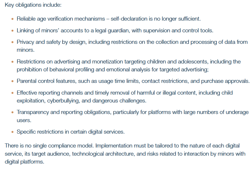 Across these diverse approaches, certain patterns emerge. Countries that combine clear legal age limits with active parental involvement and platform accountability tend to create more enforceable frameworks. Conversely, models that rely solely on parental oversight, like Germany and the U.S., face persistent challenges in practical compliance. Technological measures, such as those implemented in China and Indonesia, offer greater enforceability but raise questions about autonomy and privacy. Meanwhile, legislation in countries like Brazil and Portugal is particularly innovative in addressing platform design and linking corporate accountability directly to compliance, signaling a new era of proactive regulation.