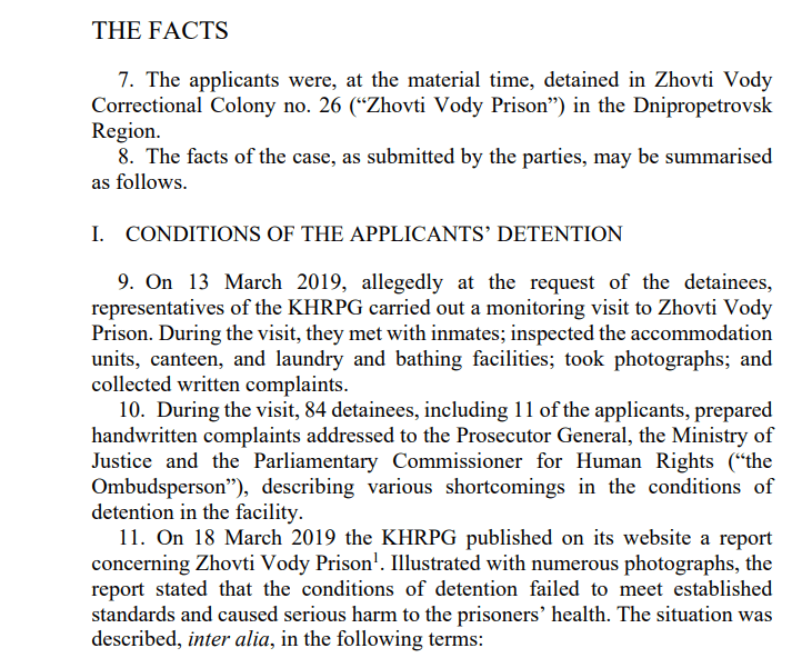 İşbu başvuru, Ukrayna’da Zhovti Vody Hapishanesi’nde tutuklu bulunan başvuru sahiplerinin, Avrupa İnsan Hakları Sözleşmesi (AİHS) Madde 3 (“İşkence Yasağı”) ve Madde 13 (“Etkili Başvuru Hakkı”) uyarınca yaşadıkları iddia edilen kötü muamele ve yetersiz koşullar ile ilgili olarak AİHM’e yaptıkları şikâyetlere ilişkindir.