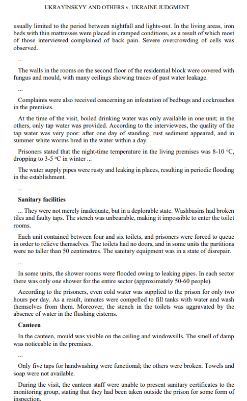 - Mahkeme, başvuru sahiplerinin tümünün 18–72 ay boyunca nemli, küflü ve soğuk hücrelerde tutulduğunu; yeterli giysi, ayakkabı ve hijyen malzemesi sağlanmadığını, elektrik ve içme suyuna erişimlerinin olmadığını ve temel hijyen koşullarından yoksun olduklarını kabul etmiştir.