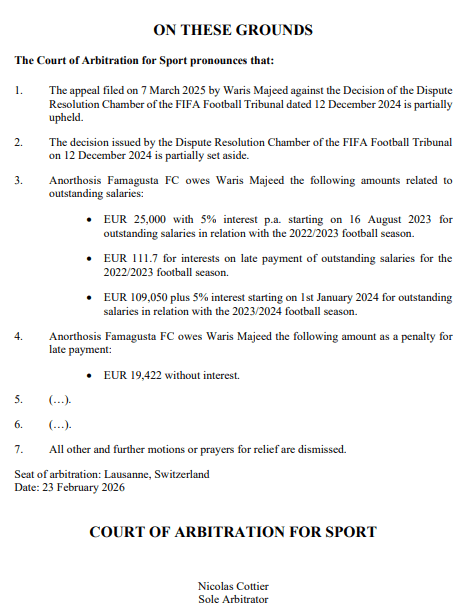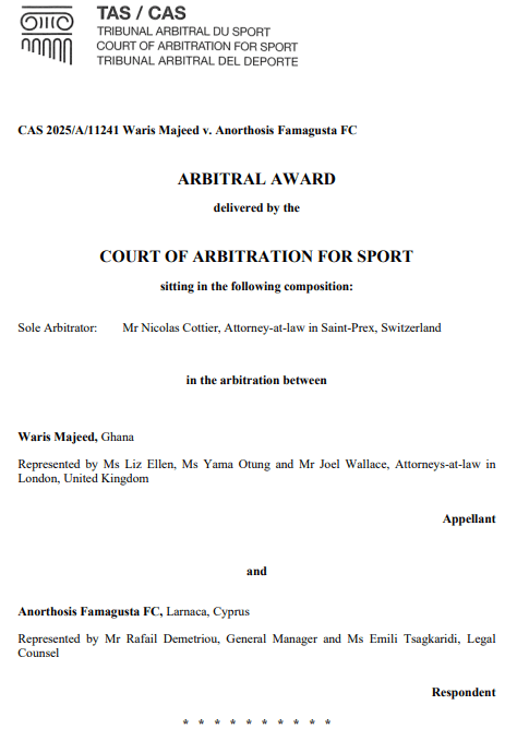 Kıbrıs Rum Kesimi ekiplerinden Anorthosis Famagusta ile Ganalı forvet Waris Majeed arasındaki finansal uyuşmazlığı konu alan bu karar, özellikle “Ödeme Planı Anlaşmaları” (PPA) ve yeni delillerin CAS aşamasında sunulması (de novo yetkisi) açısından kritik hukuki ilkeler barındırıyor diyebilirim..