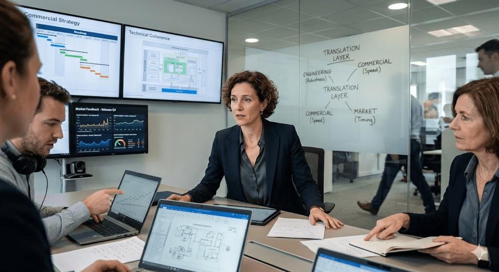 The core challenge is that different teams operate under fundamentally different cognitive frameworks. Engineering teams think in terms of constraints, architecture, and system stability. Commercial teams think in terms of positioning, velocity, and market penetration. Executive teams operate at the intersection of both, focusing on trade-offs and long-term coherence.