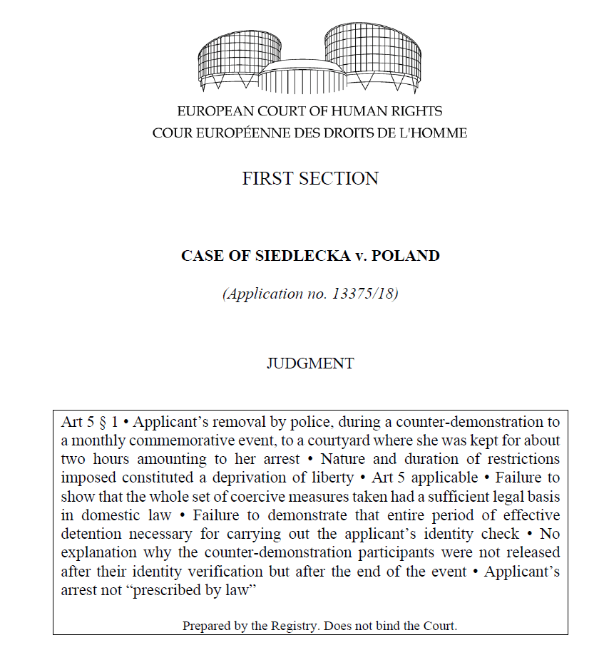 Siedlecka, bu uygulamanın hem 5. madde (özgürlük ve güvenlik hakkı) ve 10. madde hem de 11. maddeler (ifade ve toplanma özgürlüğü) açısından Avrupa İnsan Hakları Sözleşmesi (AİHS) hükümlerine aykırı olduğunu ileri sürmüştür.
