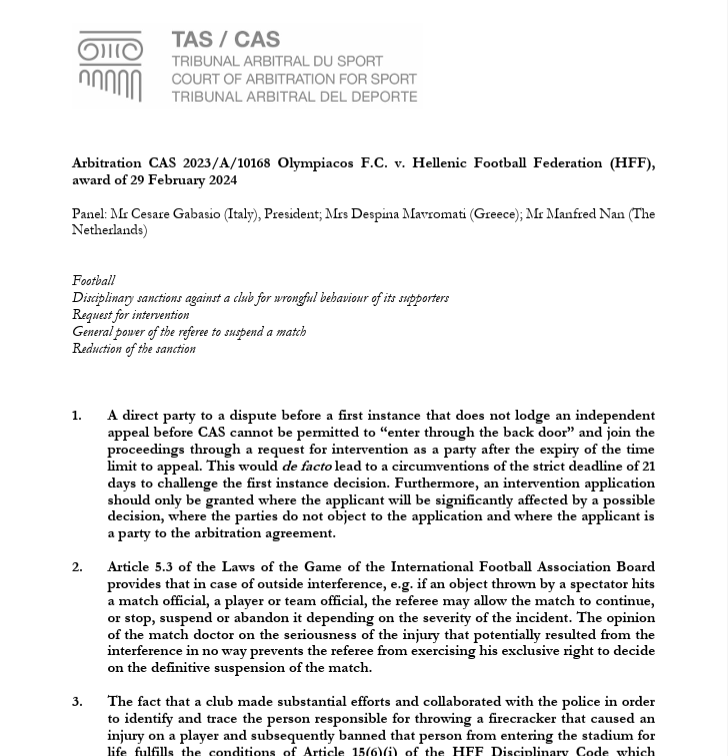 Karar, 29 Şubat 2024 tarihinde verilmiştir ve Yunanistan Süper Lig 1’deki bir maçta taraftarların neden olduğu olaylar sonrasında alınan cezaların incelenmesini içermektedir.