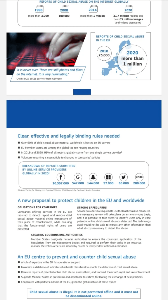 Comisión Europea; Se pretende abordar de una vez por todas el problema del abuso online con este proyecto de ley, que obligará a las empresas digitales a detectar, denunciar y eliminar el material de abuso infantil online que circule en sus plataformas.