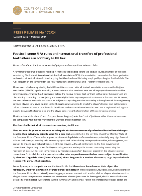 Avropa Ədalət Məhkəməsi oyunçuların Avropa İttifaqı daxilində sərbəst hərəkət hüququnu məhdudlaşdırdığına qərar verib. Ədliyyə Məhkəməsinin qərarının xülasəsində peşəkar futbolçuların beynəlxalq transferləri ilə bağlı FİFA-nın bəzi qaydalarının Avropa İttifaqı qanunlarına zidd olduğu başlığı altında aşağıdakı səbəblər irəli sürülüb.